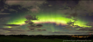 The following 3 shot panorama was taken in Scotland just before the climax, but you can already see the fine striations, and also the pink lower border, which is caused by nitrogen emissions where the aurora extends deeper than normal into the upper atmosphere.